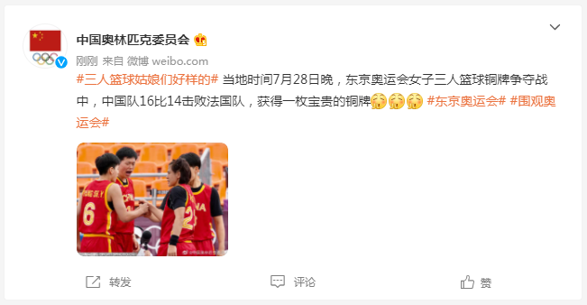 中工网讯 据中国奥林匹克委员会官方微博消息,当地时间7月28日晚,东京奥运会女子三人篮球铜牌争夺战中,中国队16比14击败法国队,获得一枚宝贵的铜牌。