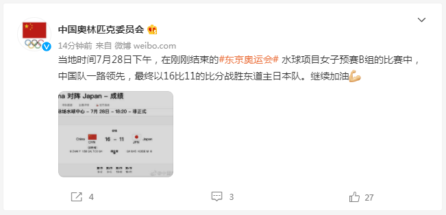 中工网讯 据中国奥林匹克委员会官方微博消息,当地时间7月28日下午,在刚刚结束的东京奥运会水球项目女子预赛B组的比赛中,中国队一路领先,最终以16比11的比分战胜东道主日本队。