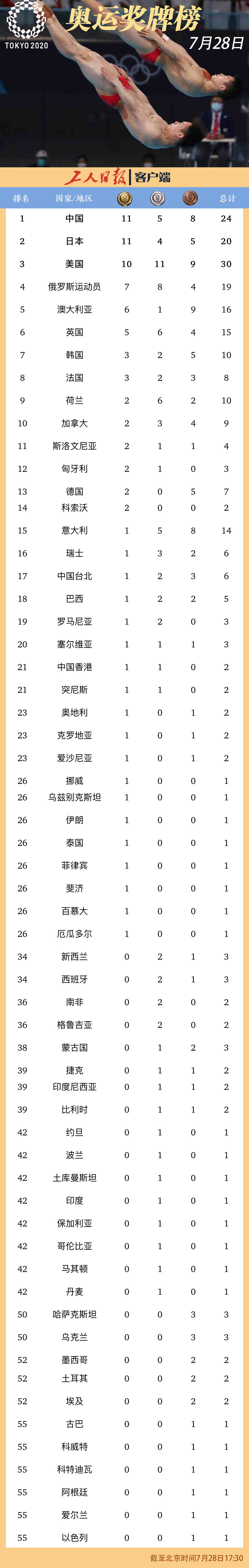 7月28日下午,在东京奥运会男子跳水双人3米板对决中,中国组合谢思埸/王宗源以467.82分的绝对实力夺冠,为中国队拿下本届奥运会第11枚金牌。至此,中国跳水队完成了本届东京奥运会所有双人项目,收获3金1银傲视赛场。28日上午,在赛艇比赛女子四人双桨项目决赛中,中国选手陈云霞、张灵、吕扬和崔晓桐以6分05秒13摘得金牌,这一成绩领先第二名6秒之多,创下世界最佳成绩;与此同时,中国组合、世锦赛冠军得主张亮/刘治宇在男子双人双桨A组比赛中,以6分03秒63的成绩名列第三,获得了中国男子赛艇在奥运会上的首枚奖牌。