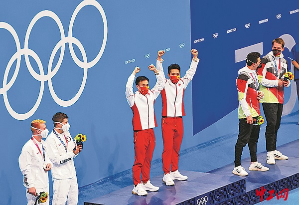 7月28日,在男子跳水双人3米板决赛中,中国组合谢思埸、王宗源夺得冠军。工人日报—中工网特派记者 杨登峰 摄