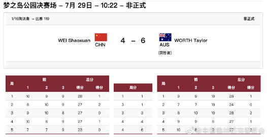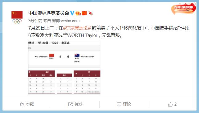 7月29日上午,在东京奥运会射箭男子个人1/16淘汰赛中,中国选手魏绍轩4比6不敌澳大利亚选手WORTH Taylor,无缘晋级。