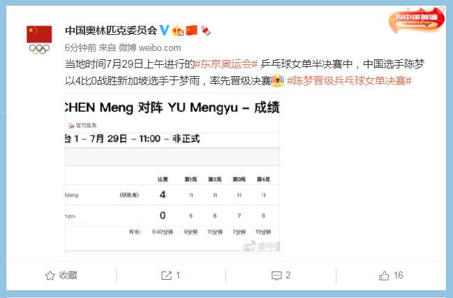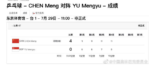 当地时间7月29日上午进行的东京奥运会乒乓球女单半决赛中,中国选手陈梦以4比0战胜新加坡选手于梦雨,率先晋级决赛。