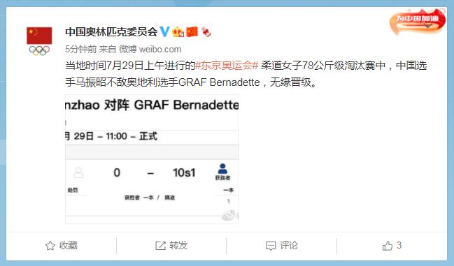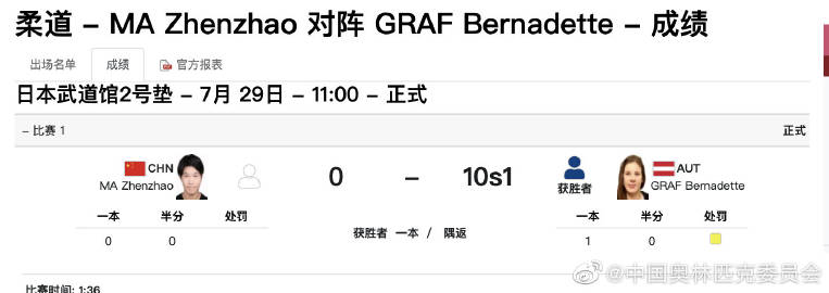 当地时间7月29日上午进行的东京奥运会柔道女子78公斤级淘汰赛中,中国选手马振昭不敌奥地利选手GRAF Bernadette,无缘晋级。