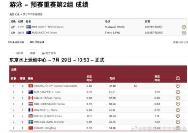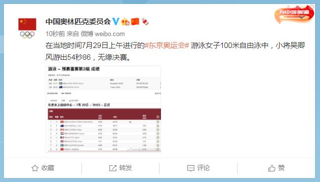 在当地时间7月29日上午进行的东京奥运会游泳女子100米自由泳半决赛中,小将吴卿风游出54秒86,无缘决赛。