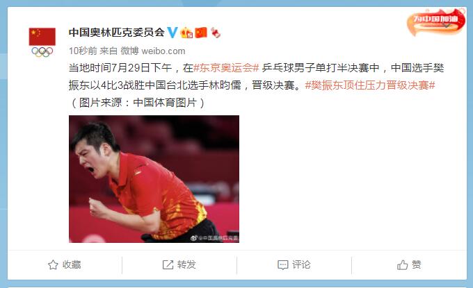 中工网讯 据中国奥林匹克委员会官微消息,当地时间7月29日下午,在东京奥运会乒乓球男子单打半决赛中,中国选手樊振东以4比3战胜中国台北选手林昀儒,晋级决赛。
