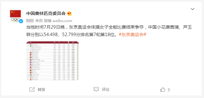 中工网讯 据中国奥林匹克委员会官方微博消息,当地时间7月29日晚,东京奥运会体操女子全能比赛结束争夺,中国小花唐茜靖、芦玉菲分别以54.498、52.799分排名第7和第18位。