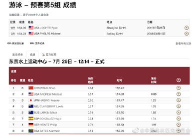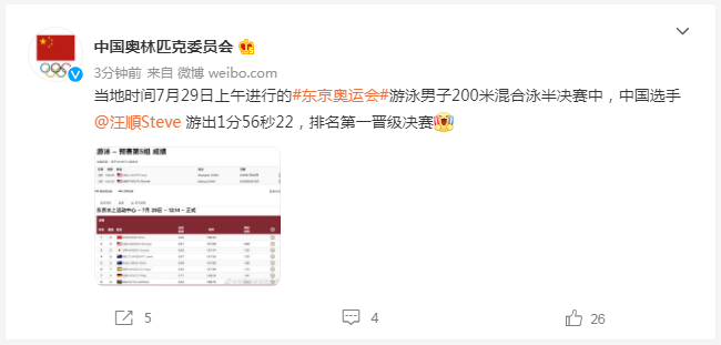 中工网讯 据中国奥林匹克委员会官微消息,当地时间7月29日上午进行的东京奥运会游泳男子200米混合泳半决赛中,中国选手汪顺游出1分56秒22,排名第一晋级决赛。