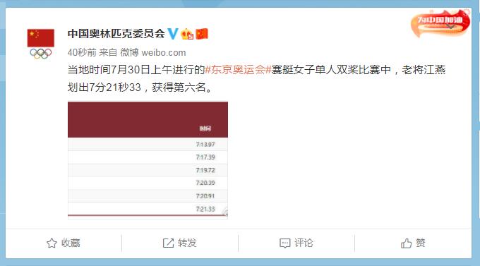 中工网讯 据中国奥林匹克委员会官微消息,当地时间7月30日上午进行的东京奥运会赛艇女子单人双桨比赛中,老将江燕划出7分21秒33,获得第六名。