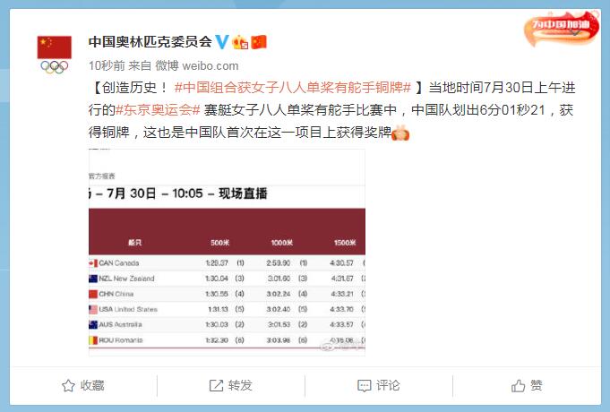 中工网讯 据中国奥林匹克委员会官微消息,当地时间7月30日上午进行的东京奥运会赛艇女子八人单桨有舵手比赛中,中国队划出6分01秒21,获得铜牌,这也是中国队首次在这一项目上获得奖牌。