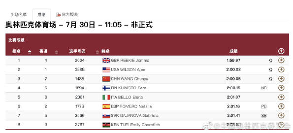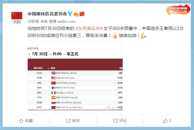 中工网讯 据中国奥林匹克委员会官微消息,当地时间7月30日结束的东京奥运会女子800米预赛中,中国选手王春雨以2分00秒05的成绩位列小组第三,晋级半决赛。