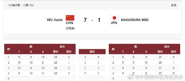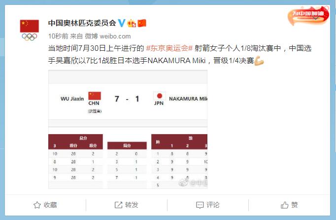 当地时间7月30日上午进行的东京奥运会射箭女子个人1/8淘汰赛中,中国选手吴嘉欣以7比1战胜日本选手NAKAMURA Miki,晋级1/4决赛。