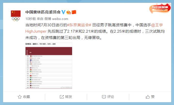 当地时间7月30日进行的东京奥运会田径男子跳高资格赛中,中国选手王宇先后跳过了2.17米和2.21米的成绩。在2.25米的成绩时,三次试跳均未成功,在资格赛的第三轮出局,无缘晋级。