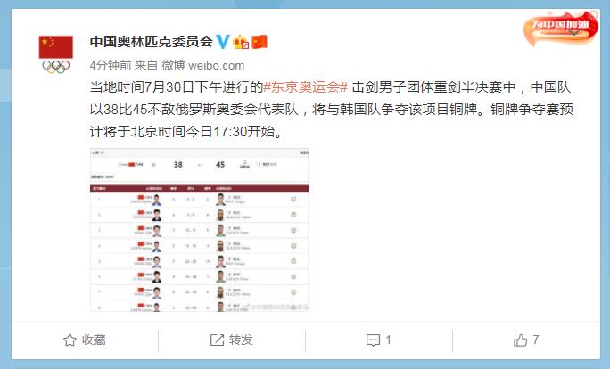 中工网讯 据中国奥林匹克委员会官微消息,当地时间7月30日下午进行的东京奥运会击剑男子团体重剑半决赛中,中国队以38比45不敌俄罗斯奥委会代表队,将与韩国队争夺该项目铜牌。铜牌争夺赛预计将于北京时间今日17:30开始。