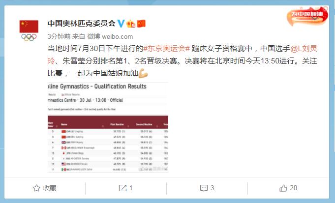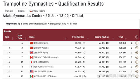 当地时间7月30日下午进行的东京奥运会蹦床女子资格赛中,中国选手刘灵玲、朱雪莹分别排名第1、2名晋级决赛。决赛将在北京时间今天13:50进行。