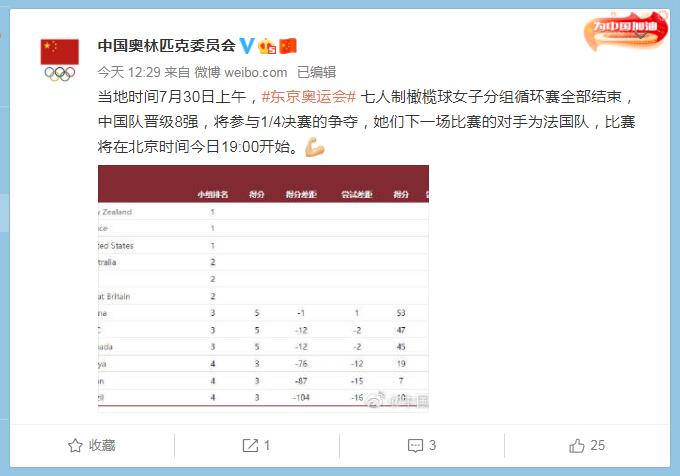 当地时间7月30日上午,东京奥运会七人制橄榄球女子分组循环赛全部结束,中国队晋级8强,将参与1/4决赛的争夺,她们下一场比赛的对手为法国队,比赛将在北京时间今日19:00开始。