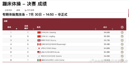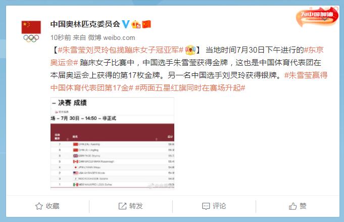 中工网讯 据中国奥林匹克委员会官微消息,当地时间7月30日下午进行的东京奥运会蹦床女子比赛中,中国选手朱雪莹获得金牌,这也是中国体育代表团在本届奥运会上获得的第17枚金牌。另一名中国选手刘灵玲获得银牌。