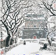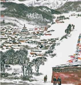 李小可对于雪的表现有着自己独特的艺术语言,他在前人“留白法”的基础上以皴擦点染代替层层的烘托晕染,不但使笔墨语言更加丰富,雪的形态与质感也更生动自然。李小可笔下的雪景呈现出不同的意境追求:北京的雪景中,古老的建筑与高大的树木相互掩映,凸显出京城大雪的苍茫与厚重;西藏的雪景中,转经的人群在雪后的寺庙里缓缓前行,这里的雪纯净而又肃穆,给人一种远离喧嚣的宁静。