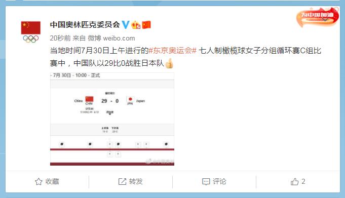 中工网讯 据中国奥林匹克委员会官微消息,当地时间7月30日上午进行的东京奥运会七人制橄榄球女子分组循环赛C组比赛中,中国队以29比0战胜日本队。