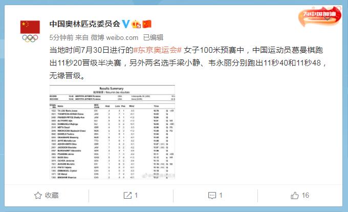 中工网讯 据中国奥林匹克委员会官微消息,当地时间7月30日进行的东京奥运会女子100米预赛中,中国运动员葛曼棋跑出11秒20晋级半决赛,另外两名选手梁小静、韦永丽分别跑出11秒40和11秒48,无缘晋级。