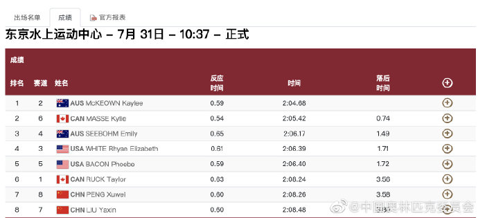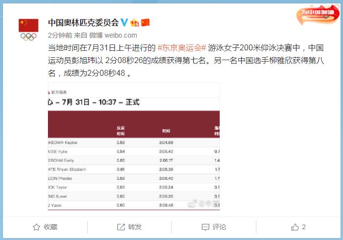 中工网讯 据中国奥林匹克委员会官微消息,当地时间在7月31日上午进行的东京奥运会游泳女子200米仰泳决赛中,中国运动员彭旭玮以2分08秒26的成绩获得第七名。另一名中国选手柳雅欣获得第八名,成绩为2分08秒48 。