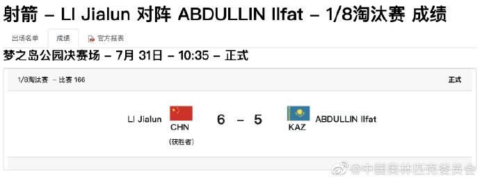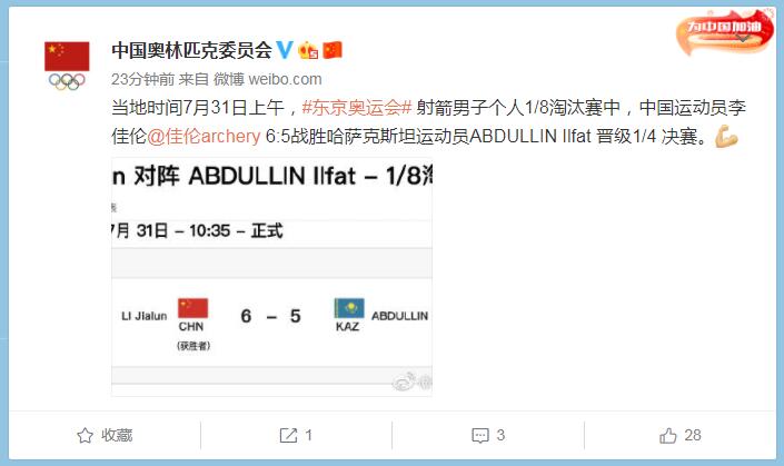 中工网讯 据中国奥林匹克委员会官微消息,当地时间7月31日上午,东京奥运会射箭男子个人1/8淘汰赛中,中国运动员李佳伦6:5战胜哈萨克斯坦运动员ABDULLIN Ilfat 晋级1/4 决赛。
