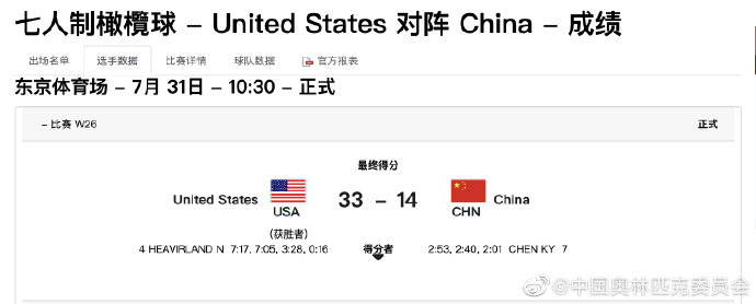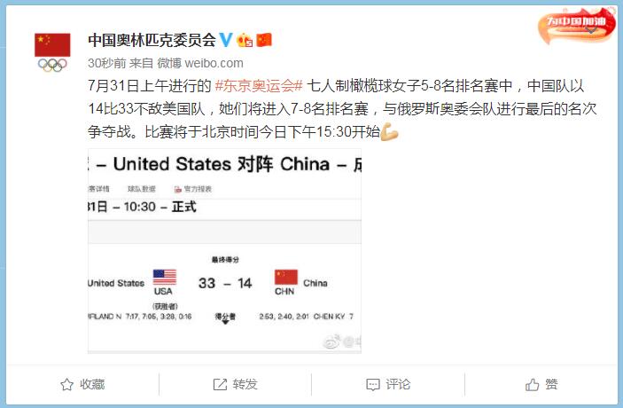 中工网讯 据中国奥林匹克委员会官微消息,7月31日上午进行的东京奥运会七人制橄榄球女子5-8名排名赛中,中国队以14比33不敌美国队,她们将进入7-8名排名赛,与俄罗斯奥委会队进行最后的名次争夺战。比赛将于北京时间今日下午15:30开始。