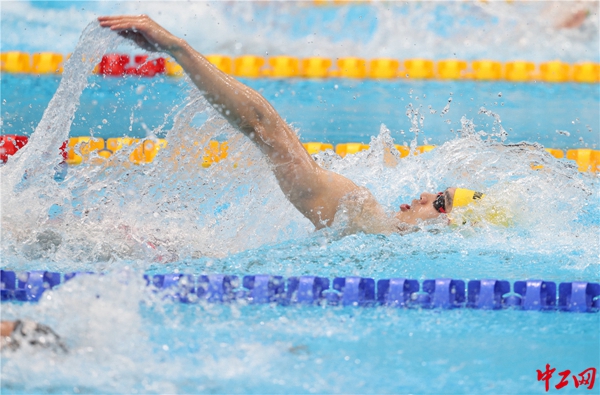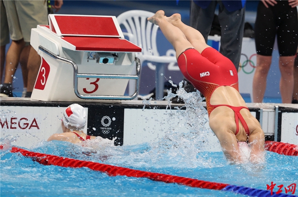 第四棒杨浚瑄(自由泳)跃入水中。