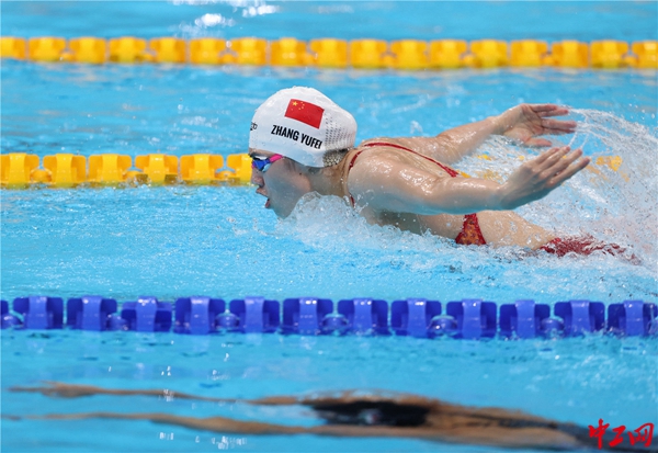 第三棒张雨霏(蝶泳)在比赛中。此前不久,张雨霏刚刚完成女子50米自由泳半决赛。