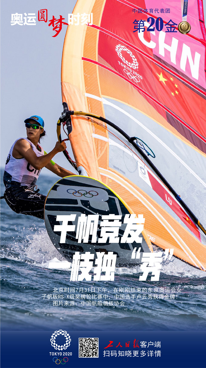 7月31日,在刚刚进行的东京奥运会女子帆板RS:X级奖牌轮比赛中,中国选手卢云秀获得金牌。