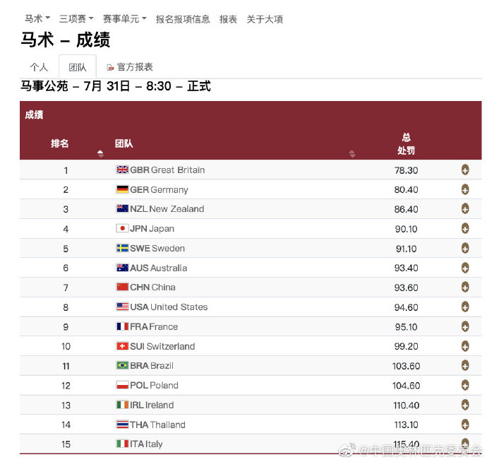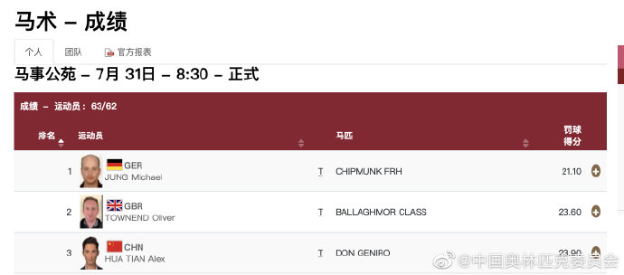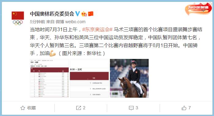 中工网讯 据中国奥林匹克委员会官微消息,当地时间7月31日上午,东京奥运会马术三项赛的首个比赛项目盛装舞步赛结束,华天、孙华东和包英凤三位中国运动员发挥稳定,中国队暂列团体第七名,华天个人暂列第三名。三项赛第二个比赛内容越野赛将于8月1日开始。