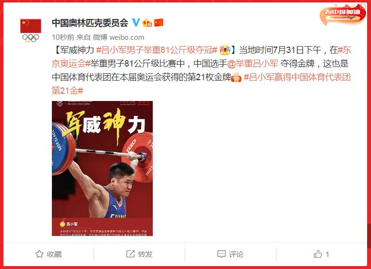 中工网讯 据中国奥林匹克委员会官微消息,当地时间7月31日下午,在东京奥运会举重男子81公斤级比赛中,中国选手吕小军夺得金牌,这也是中国体育代表团在本届奥运会获得的第21枚金牌。