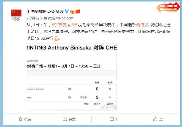 中工网讯 据中国奥林匹克委员会官微消息,8月1日下午,东京奥运会羽毛球男单半决赛中,中国选手谌龙战胜印尼选手金廷,晋级男单决赛。谌龙决赛的对手是丹麦名将安赛龙,比赛将在北京时间明日19:50进行。