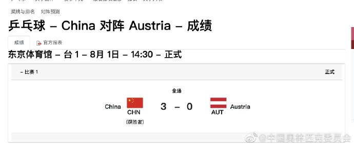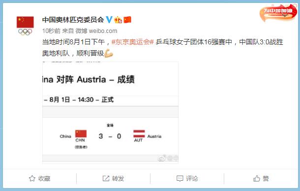 中工网讯 据中国奥林匹克委员会微博消息,当地时间8月1日下午,东京奥运会乒乓球女子团体16强赛中,中国队3:0战胜奥地利队,顺利晋级。