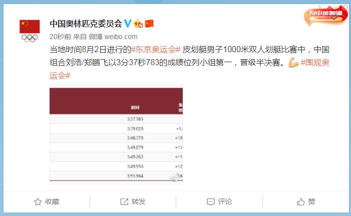 中工网讯 据中国奥林匹克委员会官微消息,当地时间8月2日进行的东京奥运会皮划艇男子1000米双人划艇比赛中,中国组合刘浩/郑鹏飞以3分37秒783的成绩位列小组第一,晋级半决赛。