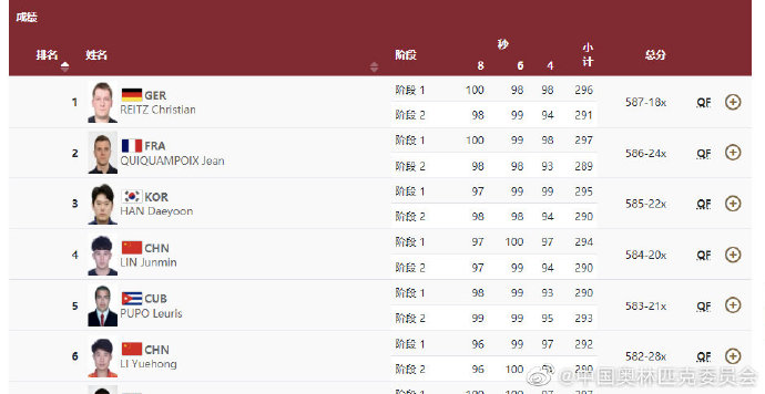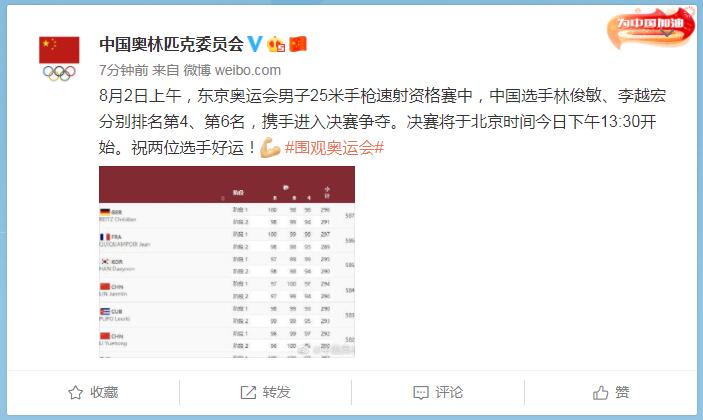 中工网讯 据中国奥林匹克委员会官微消息,8月2日上午,东京奥运会男子25米手枪速射资格赛中,中国选手林俊敏、李越宏分别排名第4、第6名,携手进入决赛争夺。决赛将于北京时间今日下午13:30开始。祝两位选手好运!
