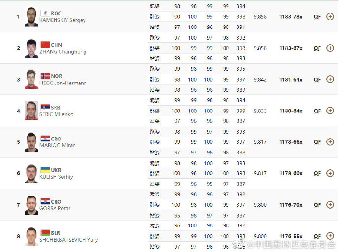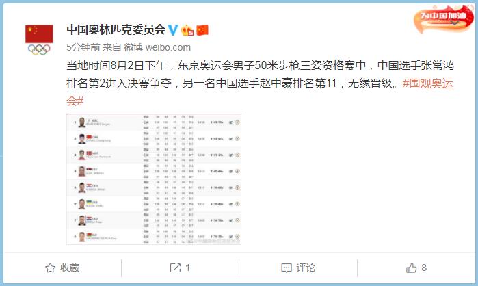 中工网讯 据中国奥林匹克委员会官微消息,当地时间8月2日下午,东京奥运会男子50米步枪三姿资格赛中,中国选手张常鸿排名第2进入决赛争夺,另一名中国选手赵中豪排名第11,无缘晋级。