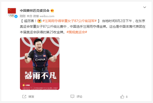 中工网讯 据中国奥林匹克委员会微博消息,当地时间8月2日下午,在东京奥运会举重女子87公斤级比赛中,中国选手汪周雨夺得金牌。这也是中国体育代表团在本届奥运会获得的第25枚金牌。