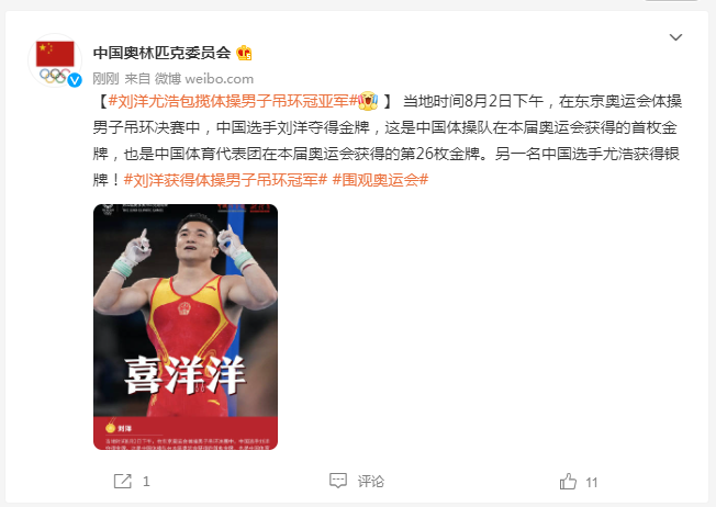 中工网讯 据中国奥林匹克委员会微博消息,当地时间8月2日下午,在东京奥运会体操男子吊环决赛中,中国选手刘洋夺得金牌,这是中国体操队在本届奥运会获得的首枚金牌,也是中国体育代表团在本届奥运会获得的第26枚金牌。另一名中国选手尤浩获得银牌!
