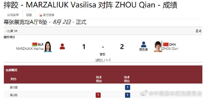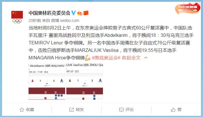 中工网讯 据中国奥林匹克委员会官微消息,当地时间8月2日上午,在东京奥运会摔跤男子古典式60公斤复活赛中,中国队选手瓦里汗·赛里克战胜阿尔及利亚选手Abdelkarim,将于晚间18:30与乌克兰选手TEMIROV Lenur争夺铜牌。另一名中国选手周倩在女子自由式76公斤级复活赛中,击败白俄罗斯选手MARZALIUK Vasilisa,将于晚间19:55与日本选手MINAGAWA Hiroe争夺铜牌。