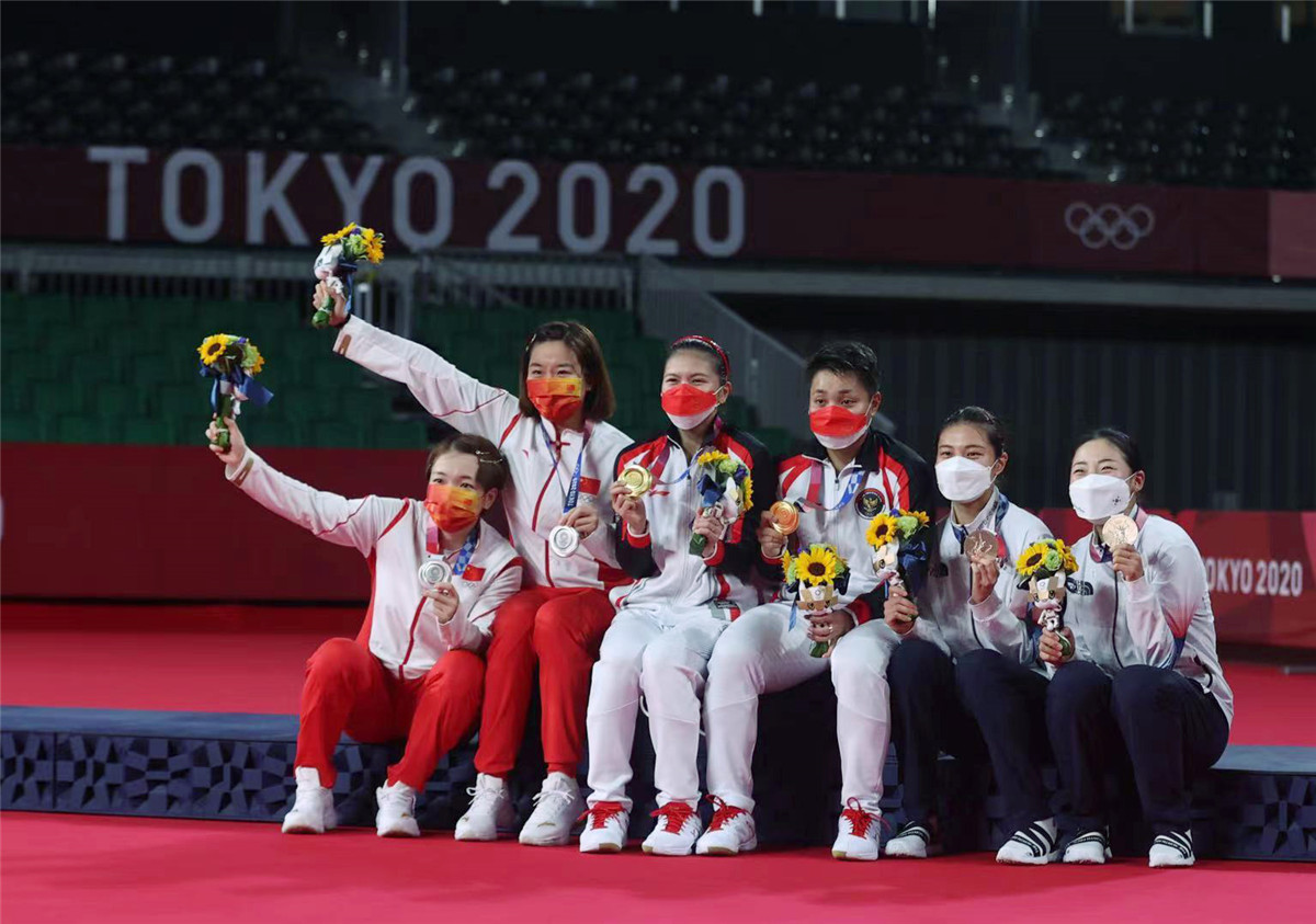 获得羽毛球女双前三名的六名选手坐在领奖台上合影。 工人日报特派记者 杨登峰 摄