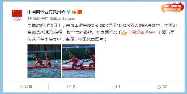 中工网讯 据中国奥林匹克委员会官微消息,当地时间8月3日上,东京奥运会皮划艇静水男子1000米双人划艇决赛中,中国组合刘浩/郑鹏飞获得一枚宝贵的银牌。