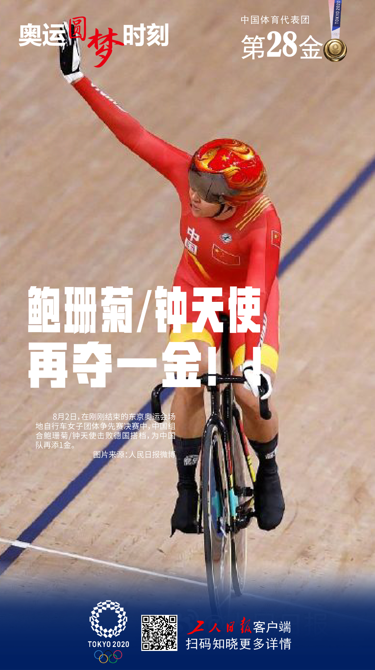 工人日报—中工网特派记者 赵晓展 杨登峰 8月2日,在刚刚结束的东京奥运会场地自行车女子团体争先赛决赛中,中国组合鲍珊菊/钟天使击败德国组合,为中国队再添1金。此前的半决赛中,中国队以31秒804的成绩打破世界纪录。
