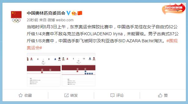 中工网讯 据中国奥林匹克委员会官微消息,当地时间8月3日上午,东京奥运会摔跤比赛中,中国选手龙佳在女子自由式62公斤级1/4决赛中不敌乌克兰选手KOLIADENKO Iryna,未能晋级。男子古典式87公斤级1/8决赛中,中国选手彭飞被阿尔及利亚选手SID AZARA Bachir淘汰。
