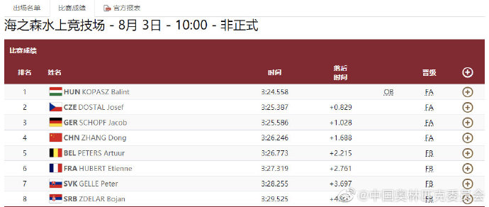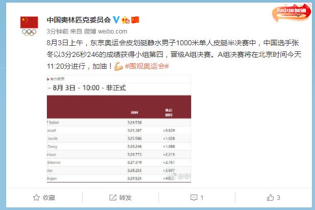 中工网讯 据中国奥林匹克委员会官微消息,8月3日上午,东京奥运会皮划艇静水男子1000米单人皮艇半决赛中,中国选手张冬以3分26秒246的成绩获得小组第四,晋级A组决赛。A组决赛将在北京时间今天11:20分进行,加油!