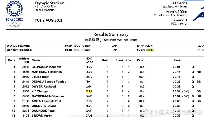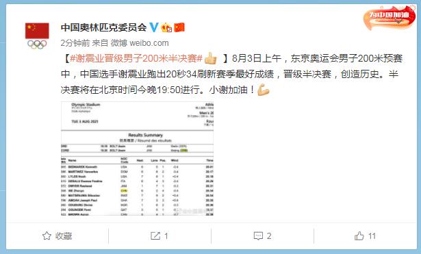 中工网讯 据中国奥林匹克委员会官微消息,8月3日上午,东京奥运会男子200米预赛中,中国选手谢震业跑出20秒34刷新赛季最好成绩,晋级半决赛,创造历史。半决赛将在北京时间今晚19:50进行。