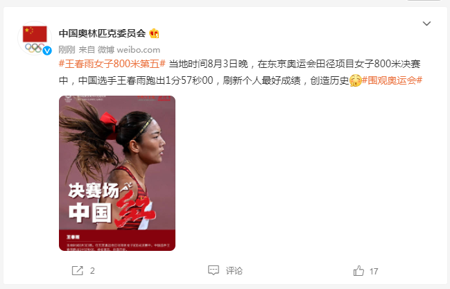 中工网讯 据中国奥林匹克委员会微博消息,当地时间8月3日晚,在东京奥运会田径项目女子800米决赛中,中国选手王春雨跑出1分57秒00,刷新个人最好成绩,创造历史。