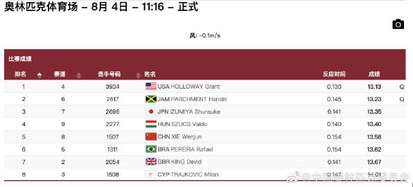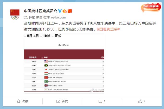 中工网讯 据中国奥林匹克委员会官微消息,当地时间8月4日上午,东京奥运会男子110米栏半决赛中,第三组出场的中国选手谢文骏跑出13秒58,位列小组第5无缘决赛。