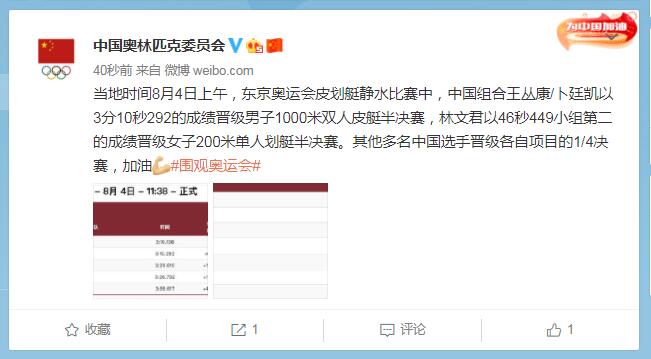 中工网讯 据中国奥林匹克委员会官微消息,当地时间8月4日上午,东京奥运会皮划艇静水比赛中,中国组合王丛康/卜廷凯以3分10秒292的成绩晋级男子1000米双人皮艇半决赛,林文君以46秒449小组第二的成绩晋级女子200米单人划艇半决赛。其他多名中国选手晋级各自项目的1/4决赛。