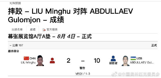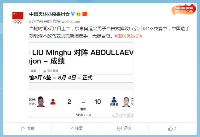 中工网讯 据中国奥林匹克委员会官微消息,当地时间8月4日上午,东京奥运会男子自由式摔跤57公斤级1/8决赛中,中国选手刘明瑚不敌乌兹别克斯坦选手,无缘晋级。