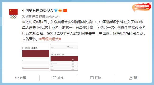 中工网讯 据中国奥林匹克委员会官微消息,当地时间8月4日,东京奥运会皮划艇静水比赛中,中国选手殷梦蝶在女子500米单人皮艇1/4决赛中排名小组第一,晋级半决赛,同组另一名中国选手黄杰仪排名第五未能晋级。在男子200米单人皮艇1/4决赛中,中国选手杨晓旭排名小组第3,未能晋级。